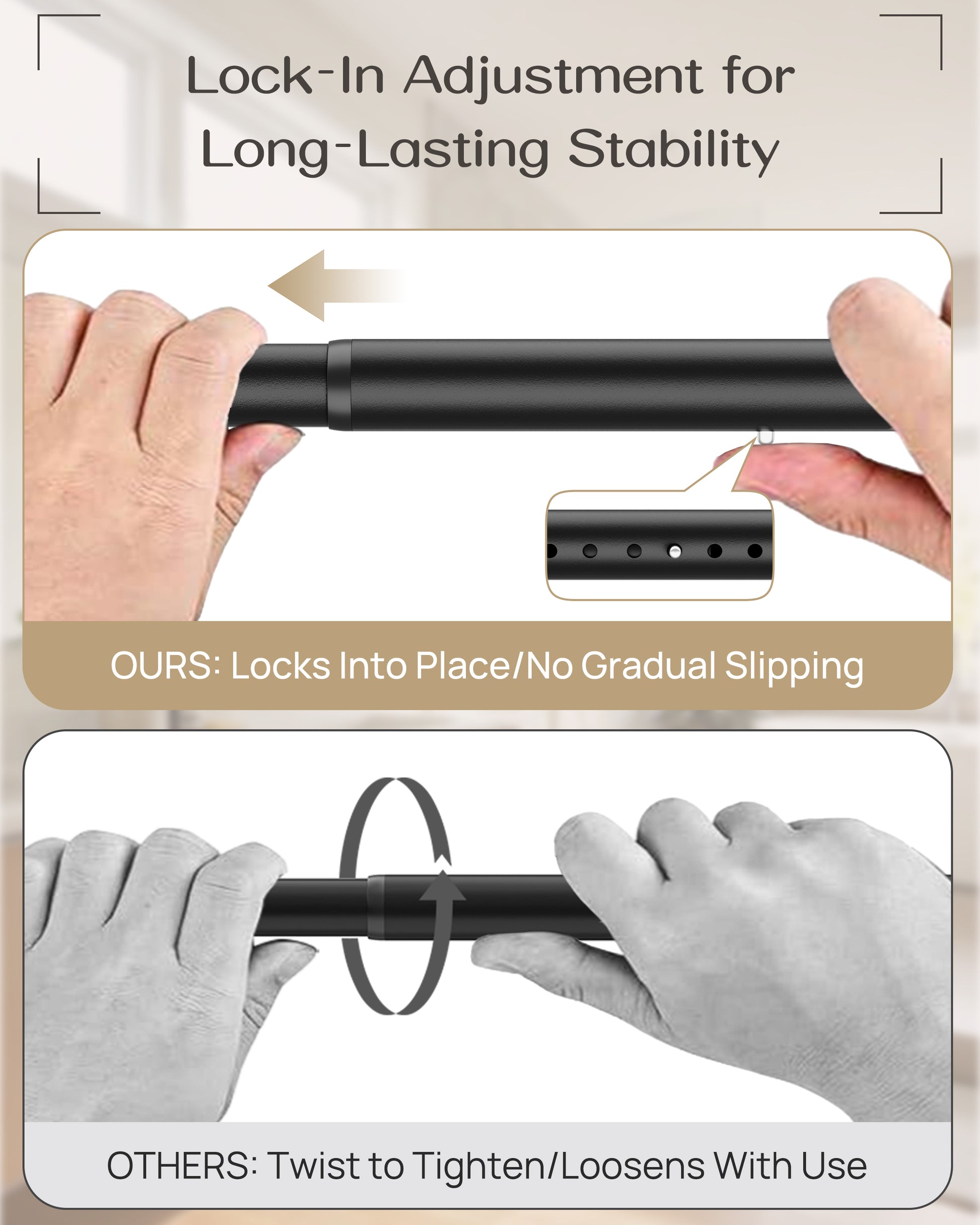 - Lock-In Adjustment System for Superior Stability This curtain tension rod features a built-in push-button locking mechanism that delivers stronger, more reliable tension than traditional twist-and-tight rods, designed to stay firmly in place without gradual loosening.