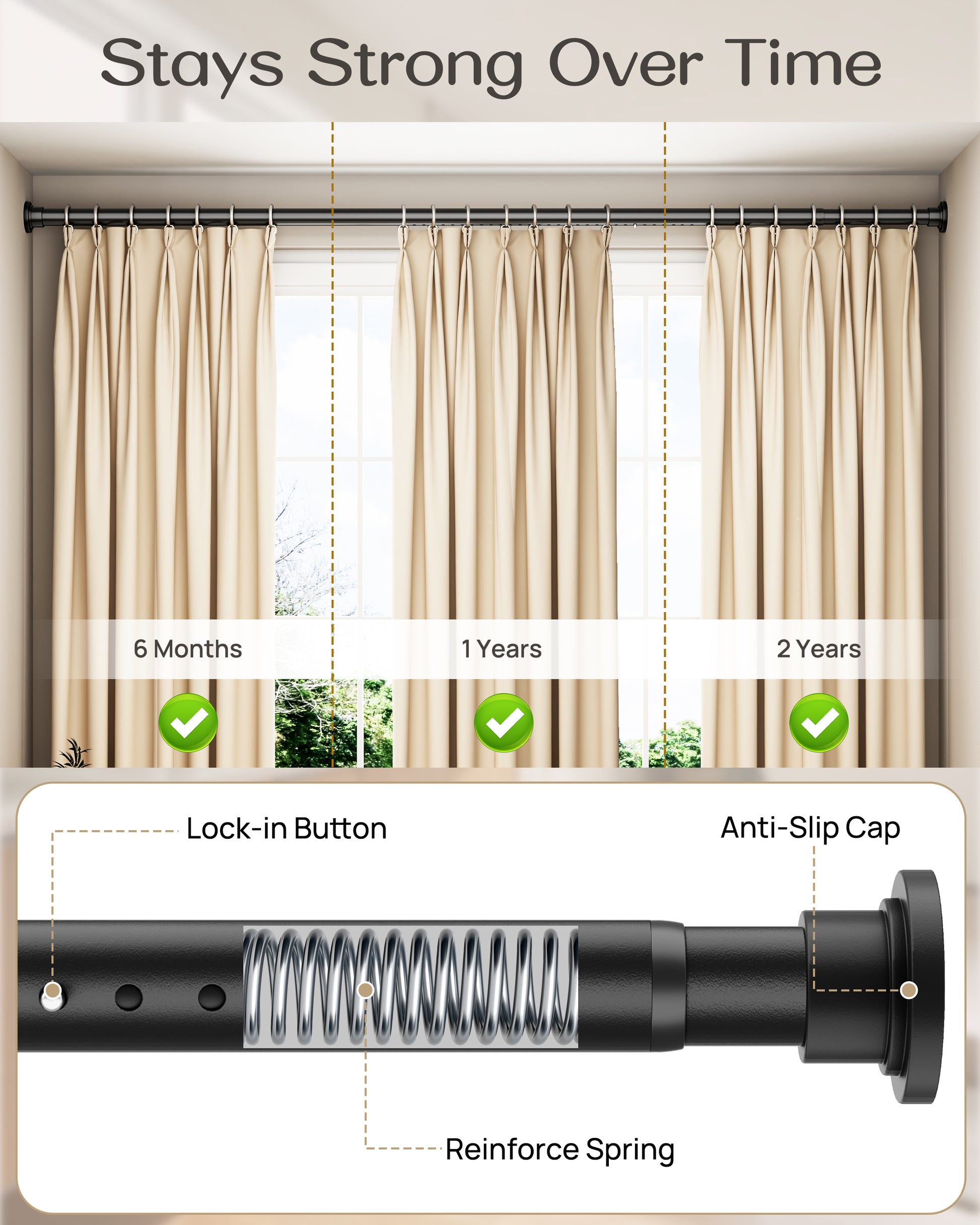 - Designed for Long-Term Everyday Reliability A reinforced internal structure and smarter adjustment design help the spring curtain rod stay level and secure over time with minimal readjustment.