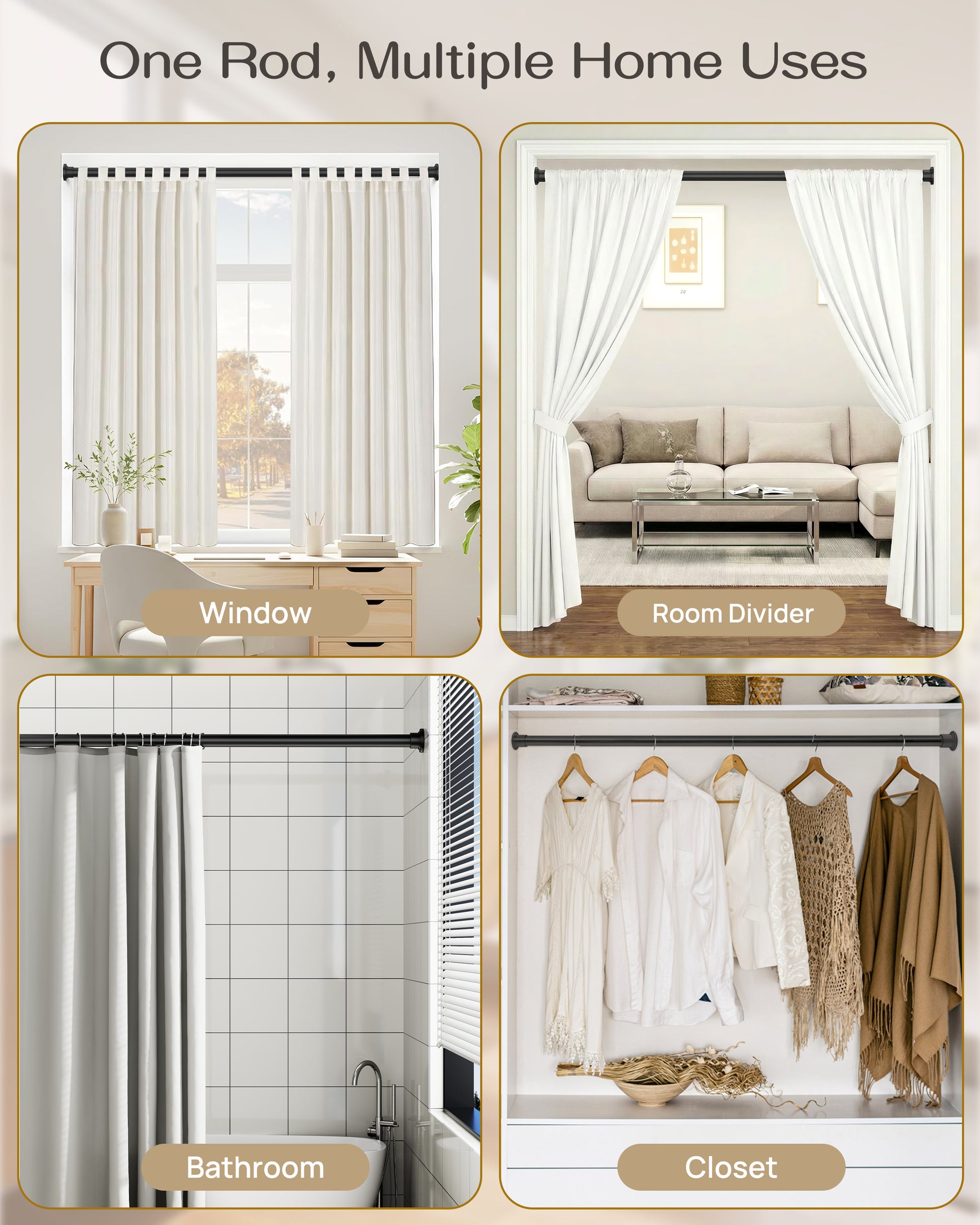 - One Rod, Multiple Home Uses Versatile tension curtain rods for windows curtains, shower curtains, closets, doorways, patios, and room dividers—enough to adapt across different spaces in your home.